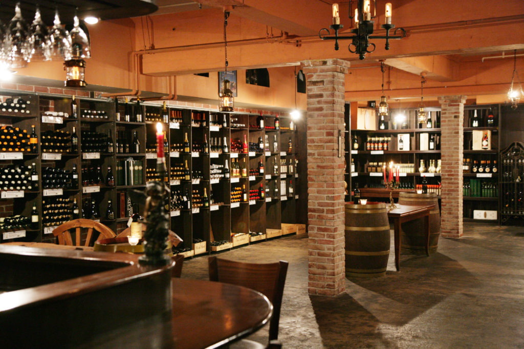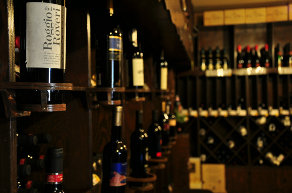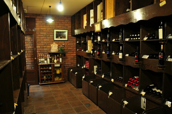 充実した直輸入のイタリアワインに、パスタ等の輸入食材も豊富に取り揃えております。高級ワインは専用のワインセラーで管理されています。