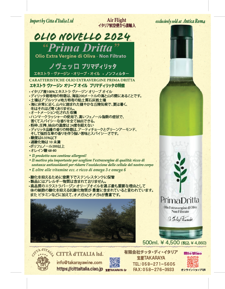 イタリア新物オリーブオイル ノヴェッロ “プリマ ディリッタ エキストラ・ヴァージン・オリーブオイル・ノンフィルター”