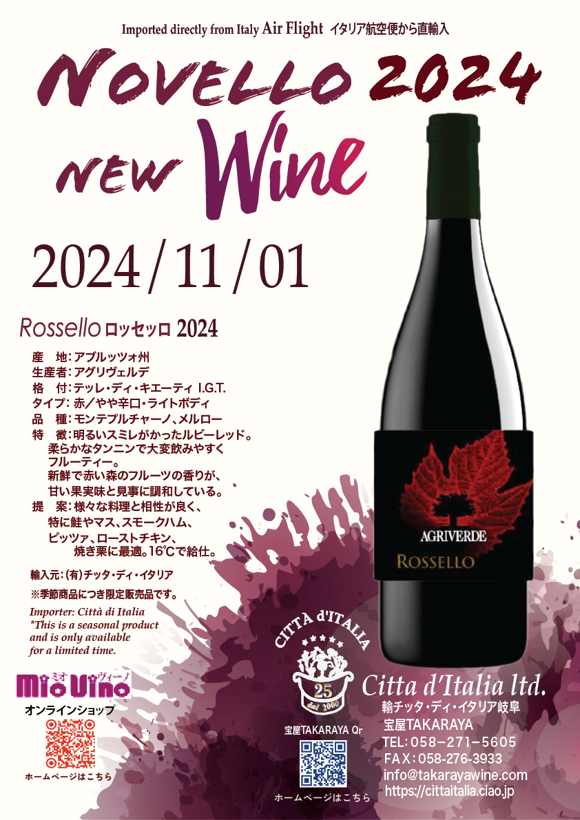 【お知らせ1】イタリア新酒 ノヴェッロ “ロッセッロ 2024”先行特別価格にて、ご予約承り開始!!10月21日(月)締切!11月01日(金)~出荷予定!!